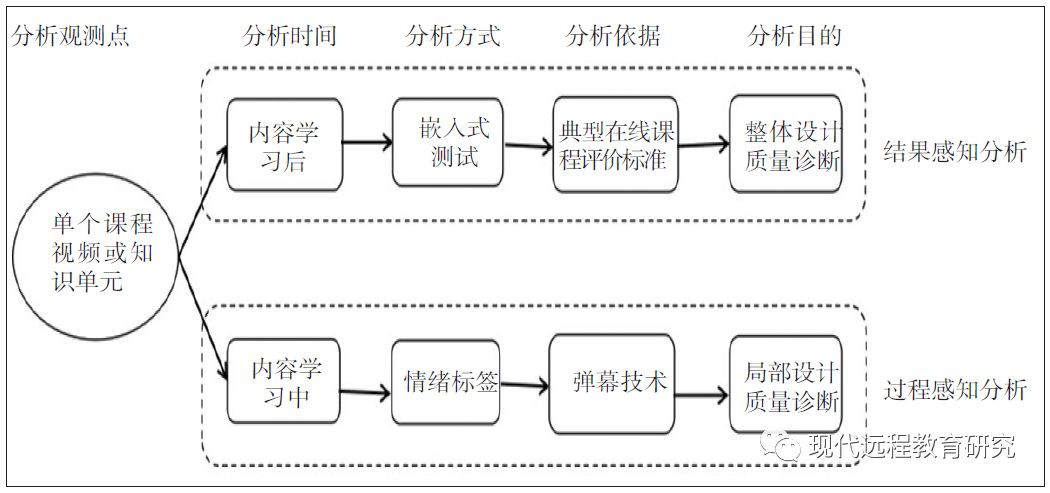 专家评审固然重要,但主要是在课程内容的科学性和逻辑性方面可以起到把关作用。学习者则是全过程地参与学习,可以从每一分每一秒来感知课程内容是否有效、是否有趣。学习者的感知信息是非常有价值的。为此,本研究从学习者感知视角出发,突破传统在线课程内容质量分析的局限,力图以更小的内容颗粒度来常态化、伴随性地开展在线课程的内容质量分析。具体而言,本研究以单个课程内容视频或知识单元为分析观测点,将学习者感知评价贯穿于整个内容学习过程,依据感知评价时间顺序将分析过程划分为结果感知分析和过程感知分析两个阶段(见图1)。其中,结果感知分析是学习者完成内容学习后对其整体质量进行的感知评价。结果感知分析主要以典型在线课程评价标准为依据,借助学习后调查来分析学习者对整体内容的质量感知,其目的在于分析与诊断课程内容的整体设计质量。过程感知分析是学习者在学习过程中的观感,主要以弹幕评论技术为基础,利用情绪标签和弹幕文本评论内容来分析学习者对特定课程内容的质量感知,其目的在于分析与诊断课程内容的局部设计质量。