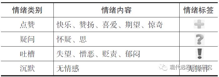 情绪标签设置主要参考徐琳宏等人提出的情感分类树,并根据在线课程学习特点对其进行修订。徐琳宏等人将人类情感划分为乐(快乐、安心)、好(赞扬、相信、尊敬、喜爱、感动、期望)、怒(愤怒)、哀(悲哀、失望、疚、思)、惊(惊奇)、恶(羞、郁闷、贬责、憎恶、妒忌、怀疑)、惧(慌、恐惧)、无情感等8种类别(徐琳宏等,2008)。网络情境中学习者的学习情绪不同于一般的人类情感,其情绪活动大致可分为点赞、疑问、吐槽、沉默四类。其中,“点赞”对应情感分类树中“乐”“好”和“惊”的部分内容;“疑问”对应情感分类树中“哀”和“恶”的部分内容;“吐槽”对应情感分类树中“哀”“恶”和“怒”的部分内容;“沉默”对应情感分类树中“无情感”的内容。为便于实际操作,本研究对学习者学习情绪进行了可视化设计,通过不同的情绪标签图标来表征其情绪内容,如表5所示。