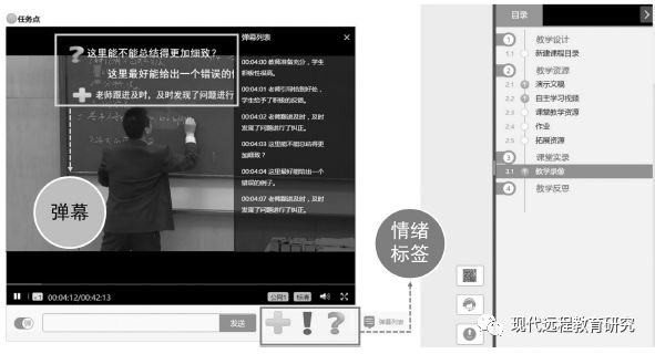 以往研究主要着眼于在线课程内容质量的事后分析,缺少开展过程性分析的技术与手段。近年来,随着弹幕评论技术的兴起及其在影视评论中的广泛应用,为从过程视角考察与分析在线课程内容质量提供了一条新的途径。“弹幕”是指在观众观看视频过程中针对某一点或某一段视频内容发放在屏幕上及时可显的字幕或表情符号(韩模永,2017)。与其他网络评价技术(如论坛、微博、调查等)不同,弹幕评论将评价内容与时间捆绑在一起,突破了传统评价的阶段化或滞后性局限,实现了完全的“实时化”与“过程化”(李海峰等,2015)。在线课程内容质量过程感知分析主要以弹幕评论技术为基础,根据在线课程学习特征对传统弹幕评论进行改造,利用情绪标签替代弹幕评论的表情符号,并将其外显化,使其成为标注学习者情绪的“指针”,用于探测与诊断在线课程内容微观层面的设计质量。