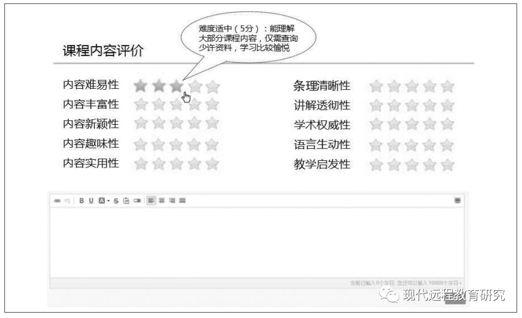 在线课程内容质量结果感知分析设计遵循用户简洁性原则,采用“五星级”图标来表征各级指标选项,并将指标选项及相应解释的文字内容完全“内隐”于系统平台。默认状态下,所有星级图标均为灰色,当学习者滑动鼠标到相应的星级图标时,系统会自动弹出一个解释对话框,该对话框中提示当前选项的名称、分值以及相应的解释信息,如图2所示。