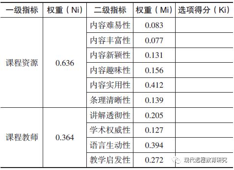 在设置在线课程质量分析指标的基础上,如何根据指标构建分析规则成为主要问题。当前学术界的指数研究做法为我们提供了启发与参考。已有研究指出,随着指数应用外延的拓展,指数分析指标已逐步多元化,定性类指标被引入到指数分析体系(张会敏,2012)。本研究参照指数研究做法,通过学习者结果感知数据来建立在线课程内容质量结果感知分析规则。首先,借助层次分析法确定各级分析指标的权重。笔者邀请15名长期从事网络教学工作的课程专家参与,依据判断矩阵两两比较原则对在线课程内容质量各级指标权重进行赋值,赋值范围为1~9。然后,采用层次分析处理软件yaahpV10.0对专家赋值数据进行统计分析。获取的各级指标权重统计结果如表4所示。其中,Mi为二级指标在一级指标上的相对权重,Ni为一级指标在课程内容质量中的相对权重,Ki为指标选项(二级指标)得分,其得分范围为1~5。需要说明的是,本研究设置的指标权重仅仅是参考值,只作为初始值使用。后续研究中,还需要依据学习者反馈数据对指标权重初始值进行校正。因为初始值主要是由专家打分获得,可能与学生数据的分析结果有一定出入。