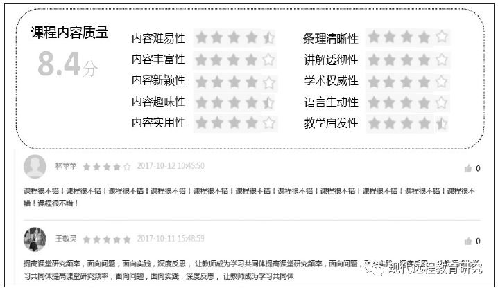 相对于前两种分析方法,学习者调查分析更能客观地反映在线课程的内容质量,成为许多培训机构广泛采用的分析方法。其最典型的实践就是学习者满意度调查。但由于以往实践多以小规模培训为主,样本比较小,加之一些学员不规范参与,导致从学习者角度反馈得到的课程内容质量评价数据误差很大,有时甚至会达到难以“容忍”的程度。可喜的是,近年来随着MOOC的兴起以及“国培计划”等大型培训项目驱动,大规模在线培训已成为“常态”。大规模在线培训的“数量优势”能在很大程度上减少或“淹没”由部分学员不规范参与而造成的样本误差,使得整体上仍能得到较为准确的分析结果。目前,已有一些实践探索,如“好知网”从学习者整体感知视角(很差、较差、还行、推荐、力荐)设计了课程质量分析方法,可以对每门课的总体质量进行调查。“MOOC学院”从学习者多重感知视角(知识点、教师参与、趣味性、课程设计、难度)设计了课程质量分析方法,可以对每门课的整体质量进行价值判断。但是总体而言,这种以满意度或质量等级判断为主的学习者调查方式,其评价颗粒度还比较大,多数研究以整个课程内容为观测点,很难有针对性地发现课程设计中存在的问题。