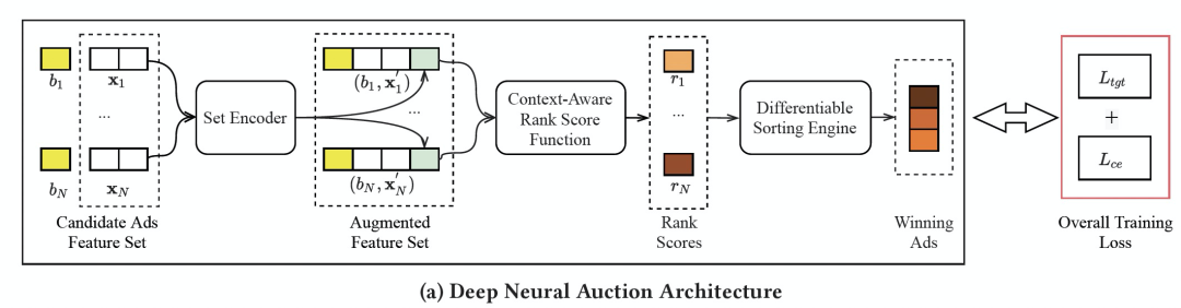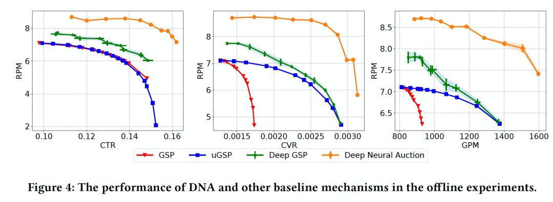 传统的拍卖机制(例如GSP/VCG)由于分配规则确定且专注于优化单一目标(例如收入/社会福利),在优化多利益方指标时可能是次优解;而经典的uGSP则严重依赖预估模型的准确性,缺乏直接对标终局效果的自适应调控能力。为了解决该问题,阿里妈妈展示广告机制策略算法团队提出一种基于深度学习的拍卖机制设计方法 —— Deep Neural Auction (DNA)。在大规模离线数据集实验以及在线A/B实验中,DNA 机制对比传统拍卖机制在优化多利益方指标上都展现出了更好的效果。