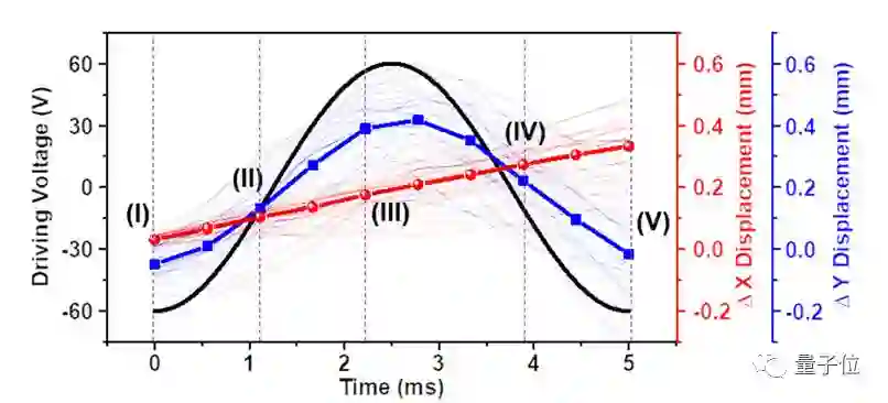蓝色则是小强机器人脊背的高度变化,随着电压波动,在电压为-60V、0V、60V、0V这四个时间点上(也就是图上的I、II、III、IV),小强一直在变化自己的身姿,脊背的高度也在随着波形变化;而当一个周期结束,电压回到-60V的时候(也就是图上的V),小强的姿势也回到了最初状态。