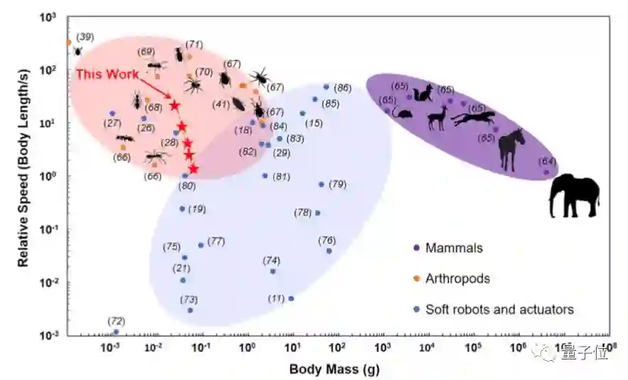 从这个大趋势中可以看出,对于哺乳动物来说,体重越小速度大多数就越快,但对于软体机器人来说这个规律恰好相反,体重减小、但速度也随之变慢。