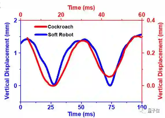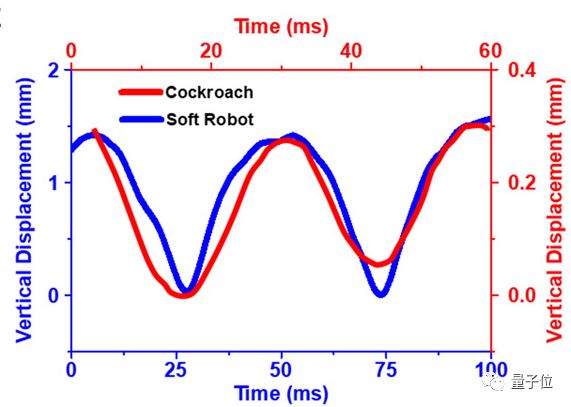 如果将小强机器人运动中的脊背高度变化拉长,拉到和生物界中真的小强一样的运动周期50毫秒,会发现两者的脊背高度波动几乎是重合的。