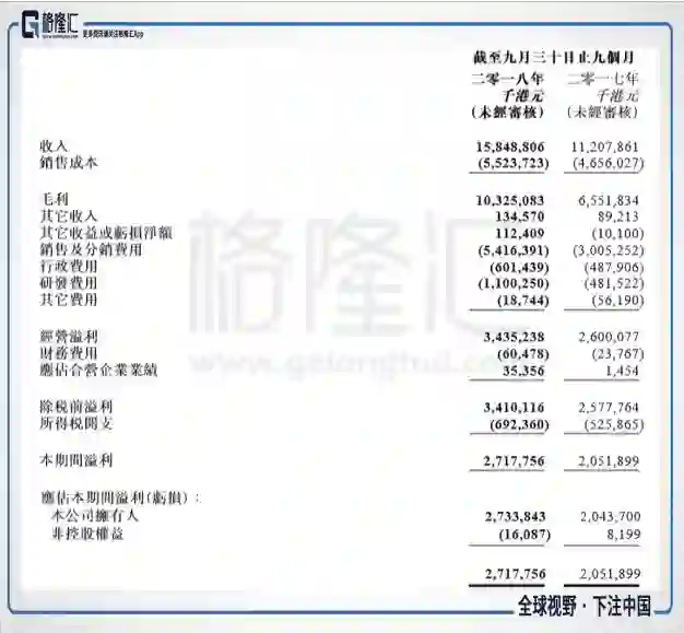 公司于11月19日发布18年三季度业绩:前三季度实现营业收入158.5亿港元,同比增34.3%(扣除汇兑损溢,下同),研发费用和销售费用的快速上涨使得利润增速低于收入增速,前三季度实现归母净利润27.3亿港元,同比增27.1%。