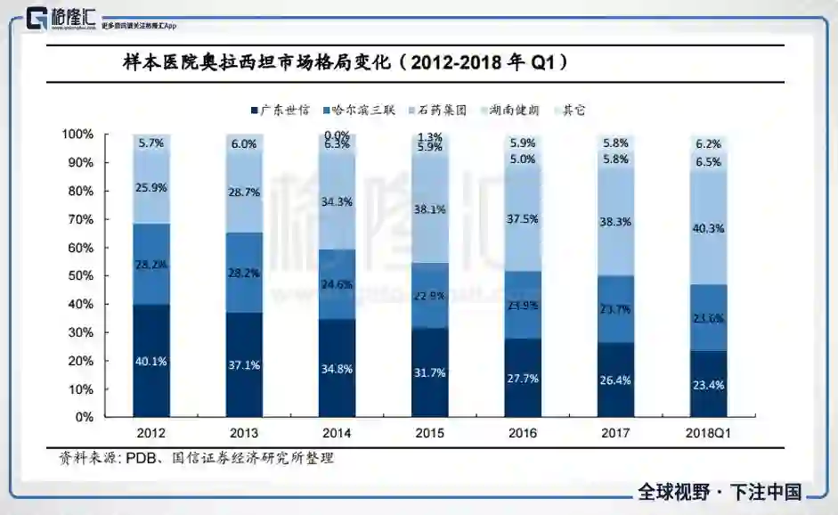 自欧来宁在2012年并入石药集团内部起,通过公司的高效运作,欧莱宁销售额迅速提高,17年销售额达到9.16亿港元,目前已经是市占率第一。而今年在奥拉西坦行业承压的情况下,公司通过将部分代理的销售模式转变为直营,实现了远超市场预期的74%的增长。
