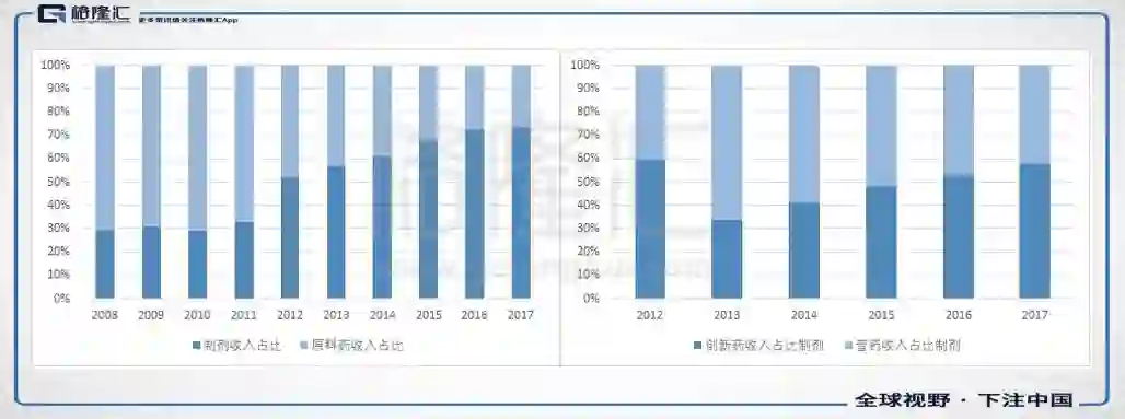 凭借重磅创新药的快速放量和不断引进新的创新药,公司的收入构成已经发生了巨大变化。2008年时,原料药收入占公司总营收的70%,而10年后的2017年,原料药占比仅剩30%。在制剂领域,创新药的占比也逐年提高。