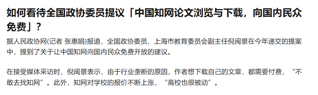 为此,还有政协委员在人大会议上提出提案,建议知网免费放开。