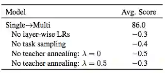 训练细节:研究人员并没有简单地对多任务模型的数据集进行 shuffle,而是遵循 Bowman 等人(2018 年)的任务抽样流程。这保证了超大数据集任务不会过度主导训练。研究人员还采用 Howard 和 Ruder(2018 年)的层级学习率技巧。