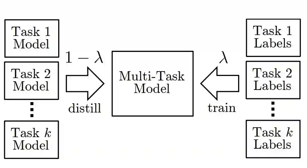 知识蒸馏即将知识从「教师」模型迁移到「学生」模型,执行方式为训练学生模型模仿教师模型的预测。在「born-again network」(Furlanello et al., 2018) 中,教师和学生具备同样的神经网络架构和模型大小,然而令人惊讶的是,学生网络的性能超越了教师网络。该研究将这一想法扩展到多任务模型训练环境中。
