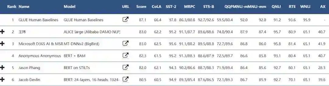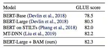 如下所示为目前 GLUE 基准的排名,Jacob 等人提出的原版 BERT 引发了一系列后续研究与改进,其中 BERT+BAM 的模型就是本文介绍的方法。