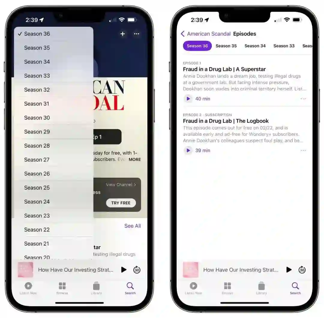 如果用户订阅的播客频道的内容有复数以上的、以「季」为单位的区分,那么在该播客频道内,用户就可以依照「季」来显示播客内容,而不需要从第一季开始往下一直滑才能找到用户想要的集数。