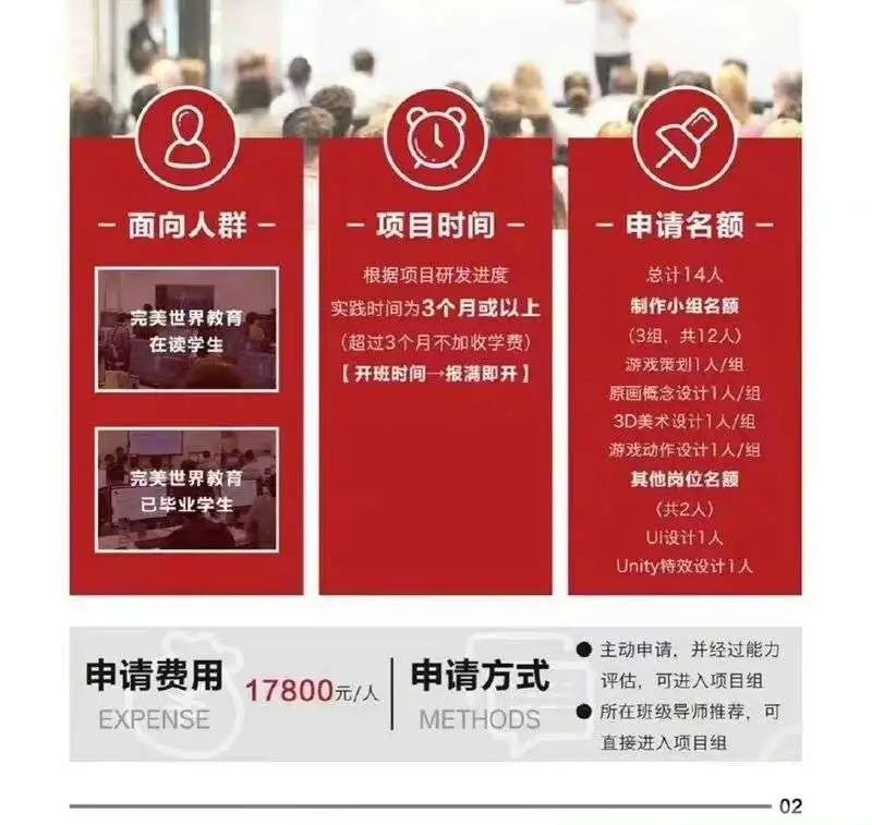该项目的申请名额是14人,其中招收的方向包括游戏策划、3D美术设计、游戏动作设计等多个类别。进入项目组后,将根据项目的研发进度,进行三个月或更长时间的实践,如果实践超过三个月不额外收费。