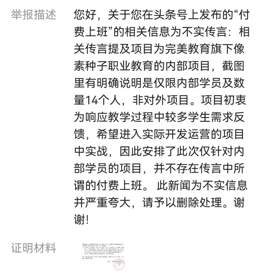 随着事情的不断发酵,完美世界相关人士表示,该项目是完美世界教育旗下像素种子职业教育的内部项目,仅收内部学员14名,而不是对外项目,并非网传的“找人付费上班”。而且这个项目是由于在教学过程中,收到较多同学的反馈,学员想进入实际开发运营的项目中实战,所以安排了这次给内部学员试验项目。