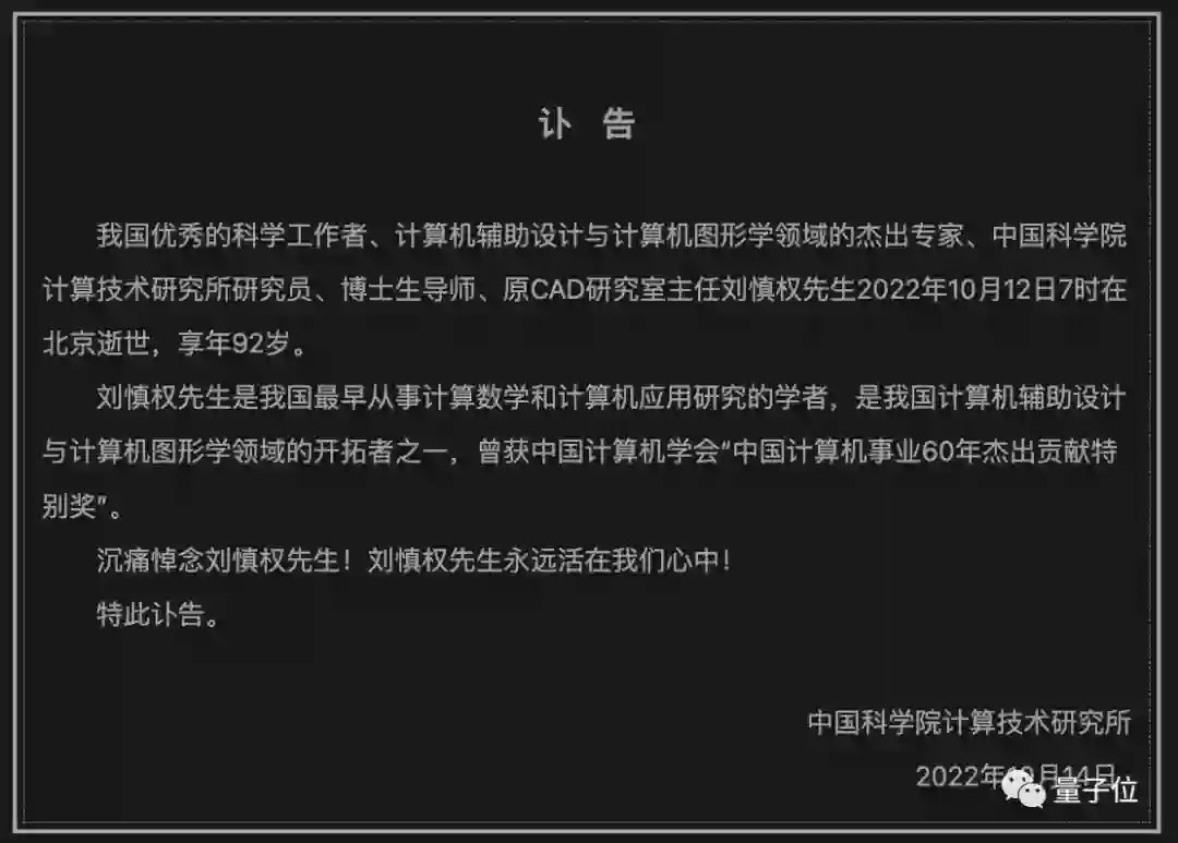 昨晚,中科院计算所发布讣告称,我国计算机辅助设计(CAD)与计算机图形学领域杰出专家刘慎权先生,2022年10月12日在京逝世,享年92岁。