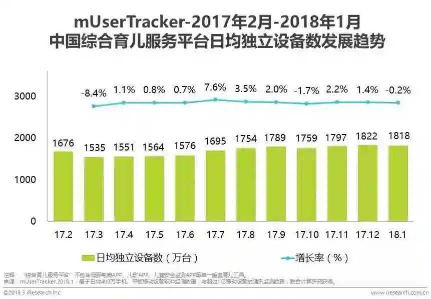 2018年1月,综合家庭育儿服务平台日均独立设备数达到1818.4万台,与2017年2月的1676.0万台相比,同比上升8.5%,其中,单月涨幅最高达到7.6%,整体增长势头稳定。其中,亲宝宝APP等头部玩家基于其先发优势,广泛布局分年龄段的多个育儿环节,率先为用户持续输出多元细分的个性化育儿服务。