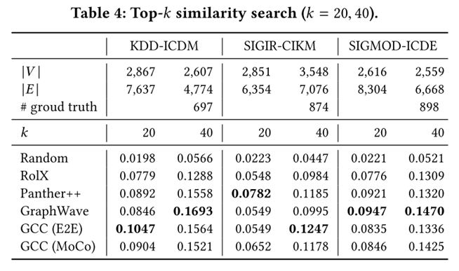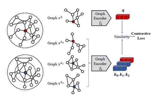 对比学习的通常范式是:对于给定的query实例 ,在众多的key实例中找出匹配 的当做正例,其余为负例。本文用两个独立的GIN模型分别编码query实例和key实例,得到相应的表示。由于本文聚焦于网络结构,因此利用网络结构对节点特征初始化,分为三部分:广义的位置表示、节点度的one-hot编码、是否为中心节点的二进制指示。通过GIN编码得到的向量最终利用L2正则化,得到最终节点表示。