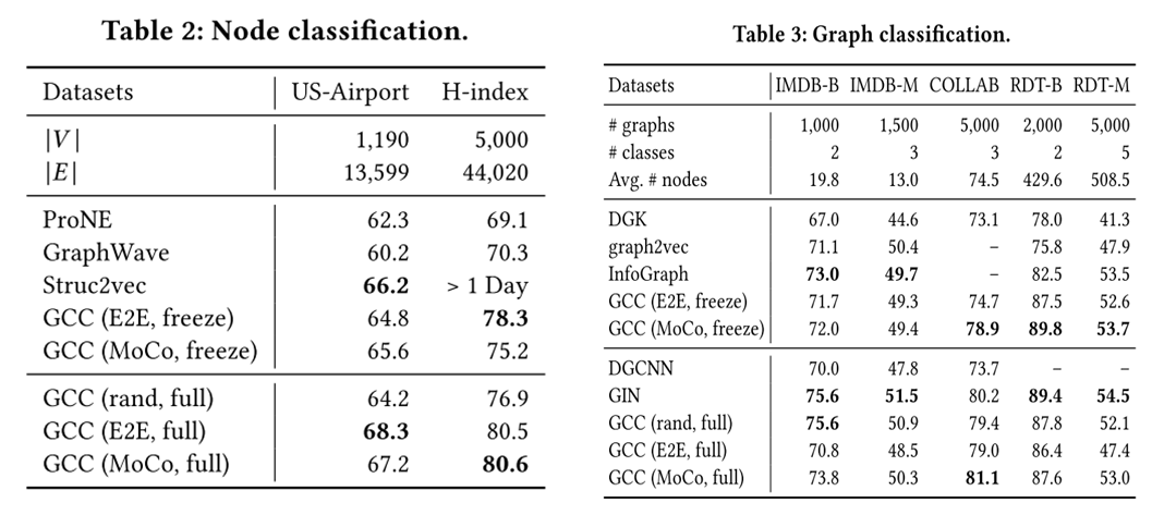 下游任务主要分为图级别的和节点级别的任务:图级别的任务直接用GIN的输出作为图的表示,节点级别的任务利用GIN对r-ego网络的编码作为中心节点的表示。依据是否在微调过程中训练GIN,本文又分了Freezing和full fine-tuning模式。作为一种关注节点局部的算法,GCC能扩展到大规模数据集以及分布式计算上。