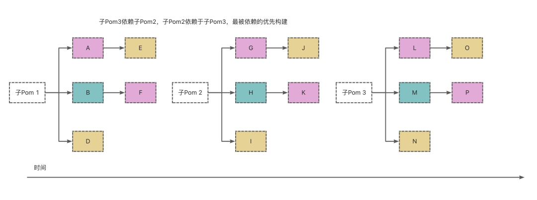 如下图子pom1 在被子pom2和子pom3同时依赖,所以子pom1最先被构建,子pom3没有人被依赖,所以最后构建。