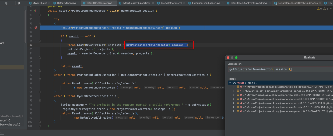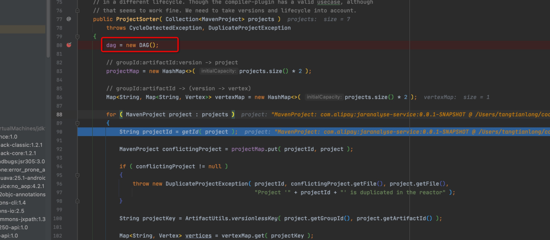 上文中我们还提到了一个非常重要的概念,就是反应堆。反应堆直接决定了各个子pom是如何决定构建顺序的。在Maven的源码中,他是在getProjectsForMavenReactor函数中进行实现的。并且我们从下图中也可以看到,Maven的反应堆是不能解决循环依赖的,他直接捕获了这种异常!