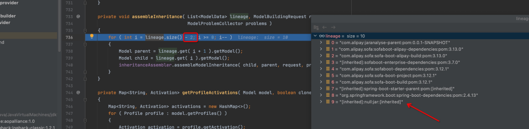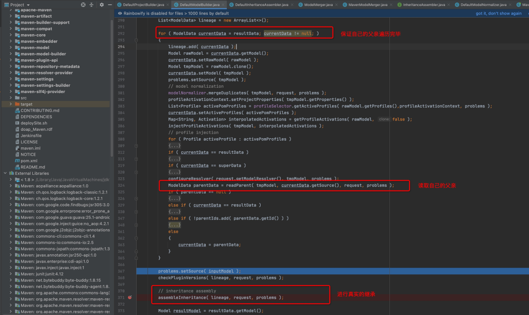 Maven中有2条非常重要的主线。一个是依赖,另一个就是继承。Maven在源码中实现继承大体如下。在下图中使用readParent进行对父亲的模型获取之后,便让自己陷入这个循环中。唯一可以出去这个循环的方式就是追不到父亲为止。并且把每次取到模型数据放到linega这个对象当中。下图中最下面的assembleInheritance我们看他消费了linega这个对象,目的就是完成真实的继承和覆盖。