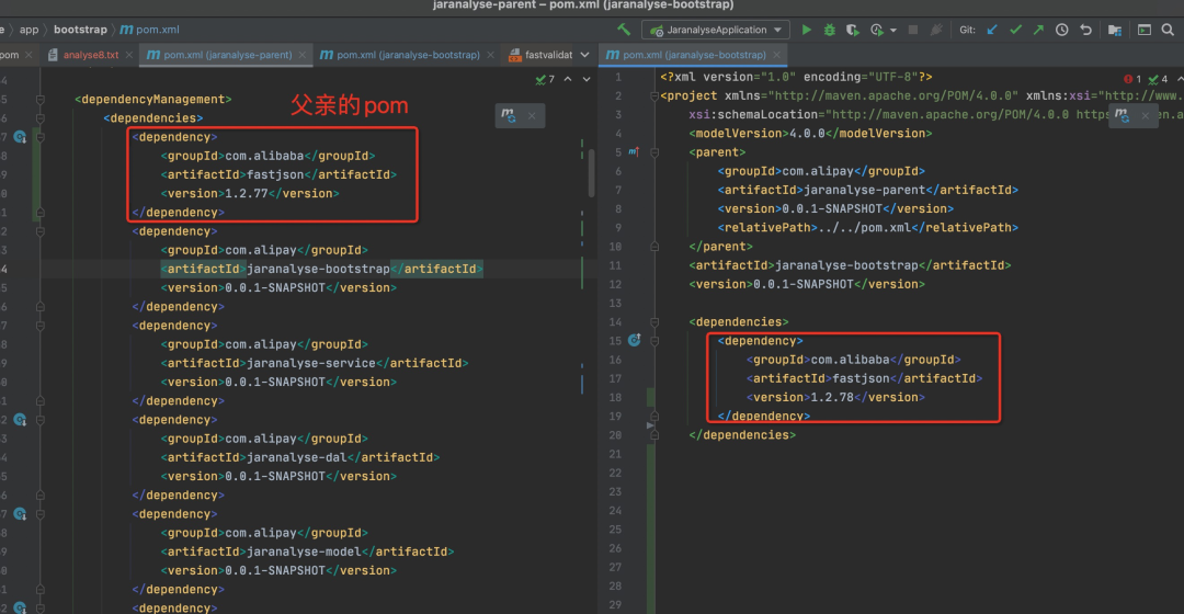 下图中左图为主POM文件内的dependencyManagement里的fastjson为1.2.77,这个时候子POM中显示声明自己的版本1.2.78。那么针对子POM这颗树,子POM会选择听从父命还是遵从内心呢?