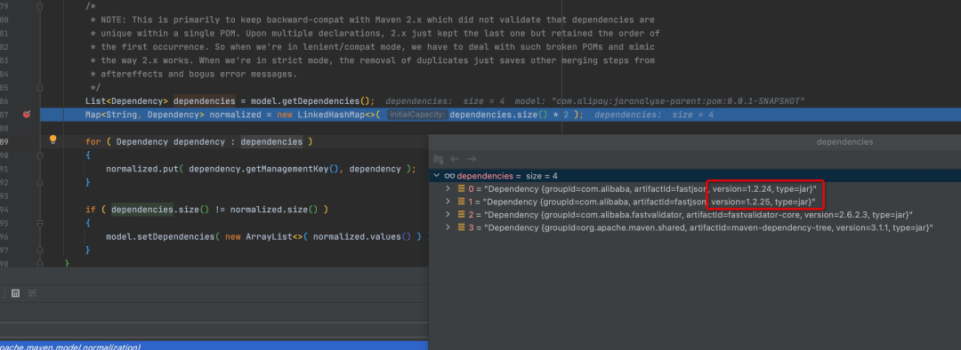 当循环进行处理到1.2.25的时候,依然进行对normalized这个map进行put操作导致了 key值相同的情况下的覆盖。