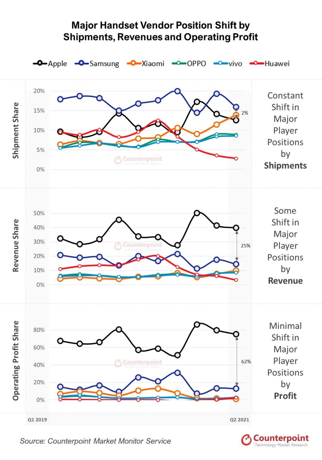 昨日,Counterpoint 发布报告文章,透露苹果在 2021 年第二季度占据全球手机市场运营利润的 75 % 和收入的 40% ,苹果一直是手机业务中最大的利润和收入来源,Apple 生态系统使得用户留存率高,市场营业利润和收入始终高居不下。此外就出货量而言,三星是全球最大的智能手机供应商,收入和利润仅次于苹果;华为由于近几个季度的重大转变导致持续下滑;而小米、OPPO 和 vivo等中国 OEM 厂商开始崛起,分别是 21 年第二季度除苹果和三星以外占比较大的收入来源。