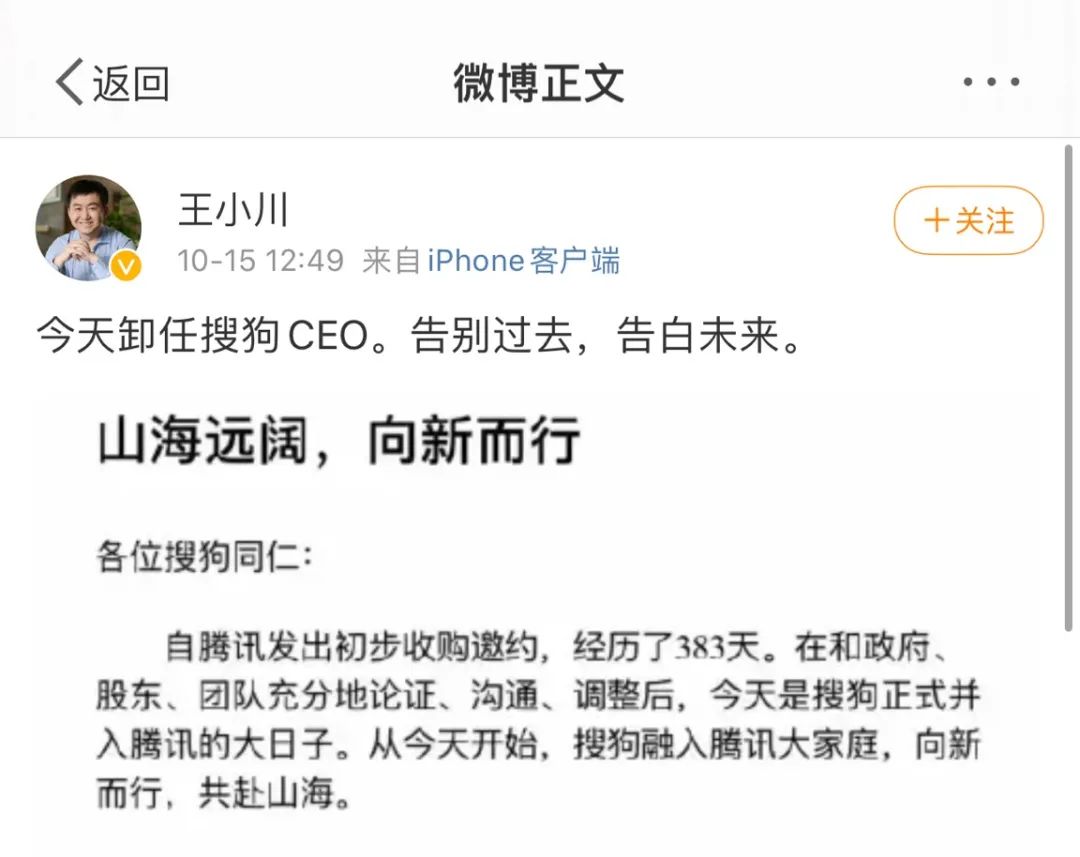根据 383 天前的约定,搜狗 CEO 王小川今天正式宣布卸任搜狗 CEO,搜狗融入腾讯大家庭。交接日上午搜狗王小川和腾讯殷宇先后发出内部信,并表示,未来搜狗搜索、输入法、PC 浏览器等核心产品将继续保持搜狗品牌运营,同时会将搜索技术与 AI 能力赋能到腾讯业务体系。目前搜狗人员及产品并入腾讯多个相关业务单元已经完成。