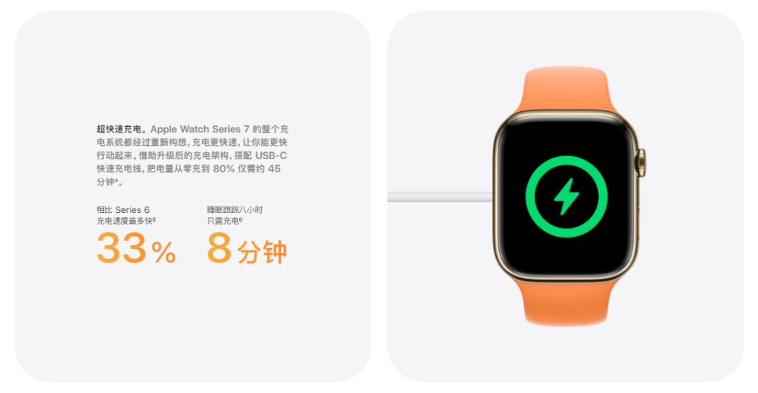 今日,Apple Watch 7 正式开售,售价 2999 元起,据 MacRumors 最新报道,苹果在第一批 Apple Watch Series 7 订单开始到货之际,发布了一份最新支持文件,透露额定功率为 18W 或更高的USB-C 电源适配器都将支持在新手表上进行快速充电。