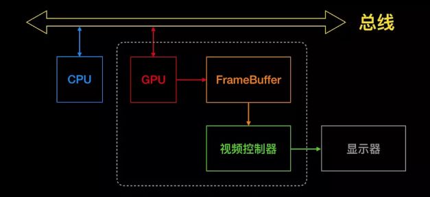 CPU将计算好的需要显示的内容提交给GPU,GPU渲染完成后将渲染结果放入帧缓冲区,随后视频控制器会按照Vsync(垂直脉冲)信号逐行读取帧缓冲区的数据,经过可能的数模转换传递给显示器进行显示。