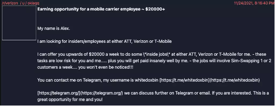 有消息人士告诉我们,至少自 2021 年 11 月以来,Lapsus$ 就一直通过各个社交媒体平台收买企业内部员工。去年,Lapsus$ 团伙的核心成员之一就曾经使用“Oklaqq”和“WhiteDoxbin”等昵称在 Reddit 上发布招聘信息,表示愿意为 AT&T、T-Mobile 以及 Verizon 的员工开出每周 2 万美元的价码,换取对方为其执行某些“内部工作”。