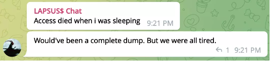 Lapsus$ 小组的一名成员在 Telegram 频道上承认,当时从微软处下载源代码的操作确被截断。