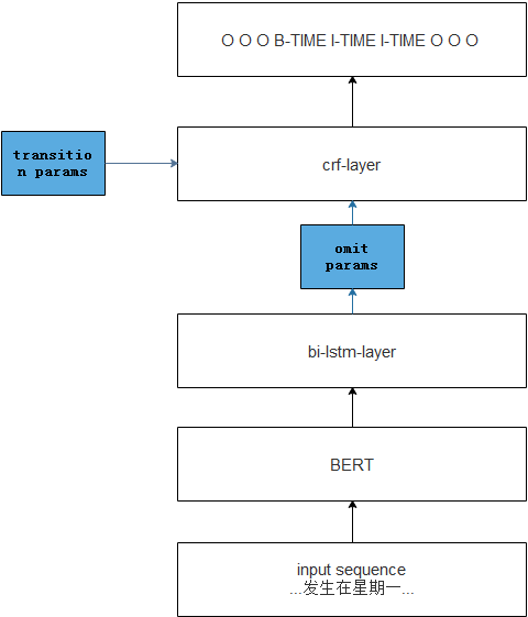 2.句子级事件抽取方法:针对不同的公告文本格式,我们设计了两种类型的事件元素抽取方式。对于结构化文本,我们通过设计模板规则,针对具体的表项抽取对应的信息;对于非结构化文本,我们设计了基于BERT+CRF的序列标注模型,将事件类型与事件要素结合,使用BIO标注方式将事件抽取任务转化为序列标注任务,同时我们结合了模板规则,对模型抽取的结果进行后处理,提升模型的准确率。模型的主体架构如图所示: