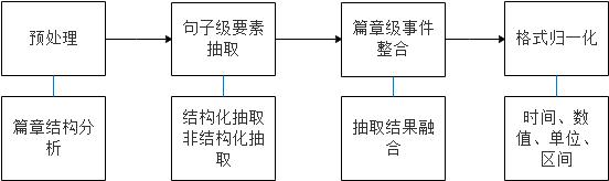 事件要素抽取主要针对公告内容,检测关注的事件类型,并针对不同事件抽取相应的要素,如主体、客体、时间等。公告事件抽取模块核心步骤如图: