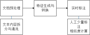 3.自动标注:对新的文本进行标注时,我们先对该文本进行步骤1和步骤2的操作,获得文本子串的向量表示,然后我们将所有文本子串的向量与历史库中已有的文本子串向量表示进行相似度计算,结合了余弦相似度、欧式距离、曼哈顿距离等相似度计算方法,根据设定的阈值若找到对应的相似子串,则根据历史文本子串的标注方式自动为当前的文本子串进行标注;若没有找到对应的相似子串,则由标注人员对其进行人为标注,并将该标注信息存储入库。通过上述方式,我们能够为相似特征的子串进行自动标注,标注人员的工作成本大大降低。