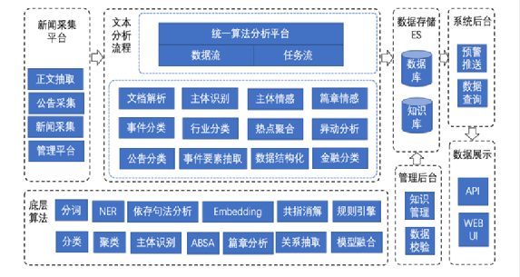 舆情系统主要包括:新闻采集平台、统一算法分析平台、知识管理后台和数据展示等部分。