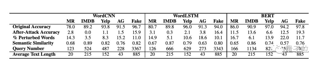 所有的模型的原来的精确度都在78%以上,像BERT则表现更优秀,在两个数据集上都能达到97%的精确度。
