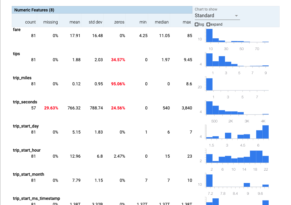 Apache Beam 支持自定义计数器,可让开发者在其流水线中创建指标。TFX 团队已使用此功能为各种组件创建有用的信息计数器。在下图中,我们可以看到在 StatistcsGen 运行期间记录的一些计数器。针对关键词“num_*_feature”进行筛选后,大致有十亿个整型和浮点特征值。