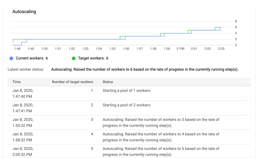 BeamDagRunner 可将 ExampleGen 和 StatisticsGen 作为单独的流水线进行提交,并可确保在启动 StatisticsGen 之前先成功完成 ExampleGen 的作业。此 Dataflow 服务可自动安排运行工作线程、自动调节、在工作线程出现故障时重试、集中日志记录和监控。 自动调节基于各种信号,包括吞吐率,如下图所示: