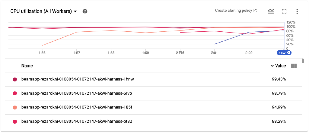Dataflow 监控控制台会显示流水线的各种指标,例如工作线程的 CPU 使用率。我们可在下图中看到机器投入运行时的使用率,该指标因大多数工作线程的使用率超过 90% 并一直保持: