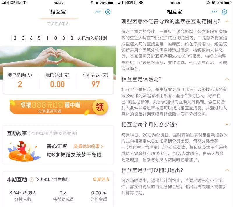 之前,相互宝公布第一批核查的互助申请,两名因意外导致重伤的成员,分别获得超过2300万“相互宝”成员共同承担的30万元大病互助金,每位参与者仅需分摊0.03元。