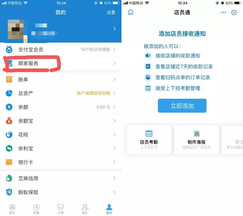 首先,开通支付宝收钱码的用户,在支付宝“我的”页面会出现“商家服务”一栏,或者直接在搜索框中搜索“商家服务”,下辖“店员通”服务。店铺老板可以添加店员,点击后弹出一个二维码,让其扫描成功后即可成为收钱码的店员,店员只有查看收钱码收钱的信息及消息提醒。
