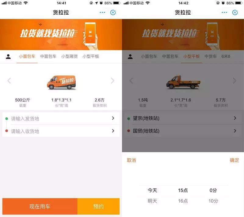以货拉拉为例,打开小程序后发现,有包括小、中型面包车、厢货车、平板车、中货车等不同型号和大小的车型,适用不同种类及体积的物件。着急的话,则可以选择“现在用车”,等待师傅接单上门即可。此外,还可以根据自己的需要预约时间,更加方便灵活。