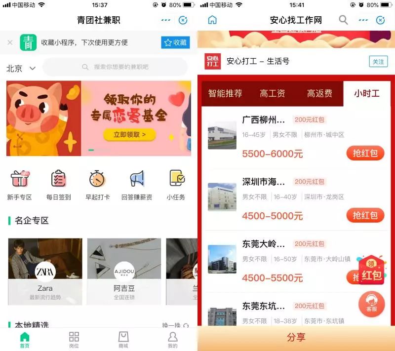 其中,青团社主要定位于大学生兼职平台,而安心找工作网侧重于蓝领找工作。对于店家来说,店家可分别根据需要,在支付宝内搜索这两款小程序,注册登录后,就可根据地区发布自家的招聘需求或寻找靠谱的人才。