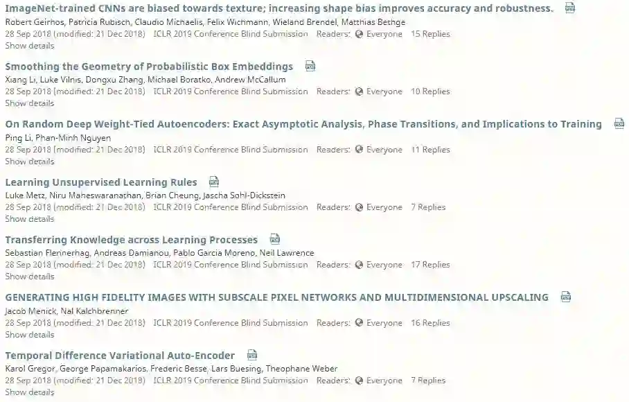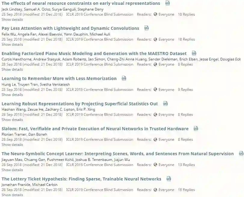 【导读】素有深度学习顶会“无冕之王”之称的ICLR 2019今天公布了录用结果。今年ICLR共接收1578篇投稿,相较去年981篇有了60%的增加,录用结果如下:1.5% 录用为 oral 论文(24篇)、30.2% 录用为 poster 论文(476篇),58% 论文被拒(918篇)、610% 撤回(160篇)。