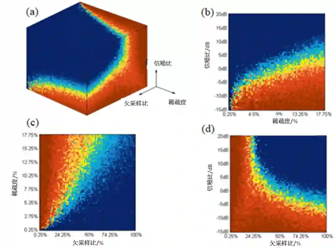 稀疏微波成像评估包括系统性能评估和图像性能评估。在系统性能评估方面,综合考虑稀疏度、降采样比、信噪比因素的三维相变图是常用的方法,它可定量反映稀疏重构条件下场景稀疏度和雷达系统之间的关系。在图像性能评估方面,既可采用分辨能力、峰值旁瓣比等经典指标,还可采用目标背景比、检测概率/虚警概率等指标。