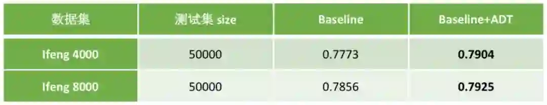 上表中,Baseline 为现有的分类模型,Baseline+ADT 指的是在现有分类模型的基础上加上对抗训练之后的模型,实验对比指标为分类精度。如上表所示在加入对抗训练后在不同测试集上均有不同程度的提升,其中在小数据集(Ifeng 4000)上提升相对更明显。